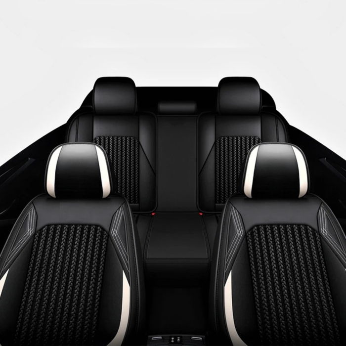 Set Huse Auto universale lux din piele ecologica cu material textil, negru si alb pentru scaune fata si spate