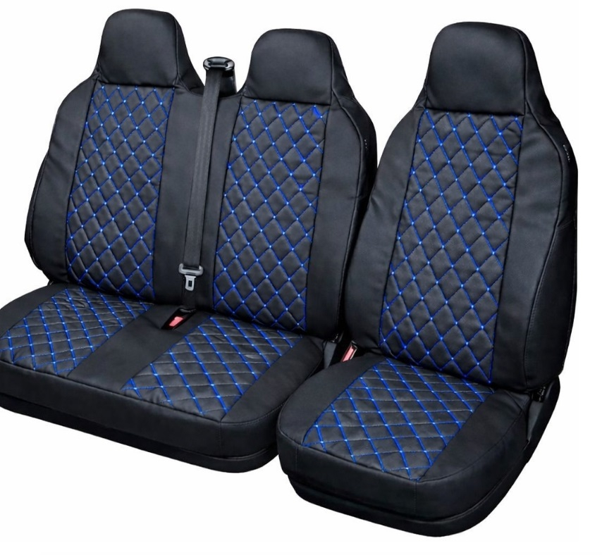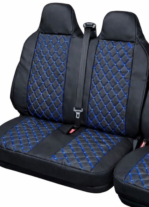 Husa de inalta calitate pentru scaunele din fata ale unui microbuz, realizata din piele ecologica rezistenta, cu design elegant capitonat si cusatura decorativa albastra.