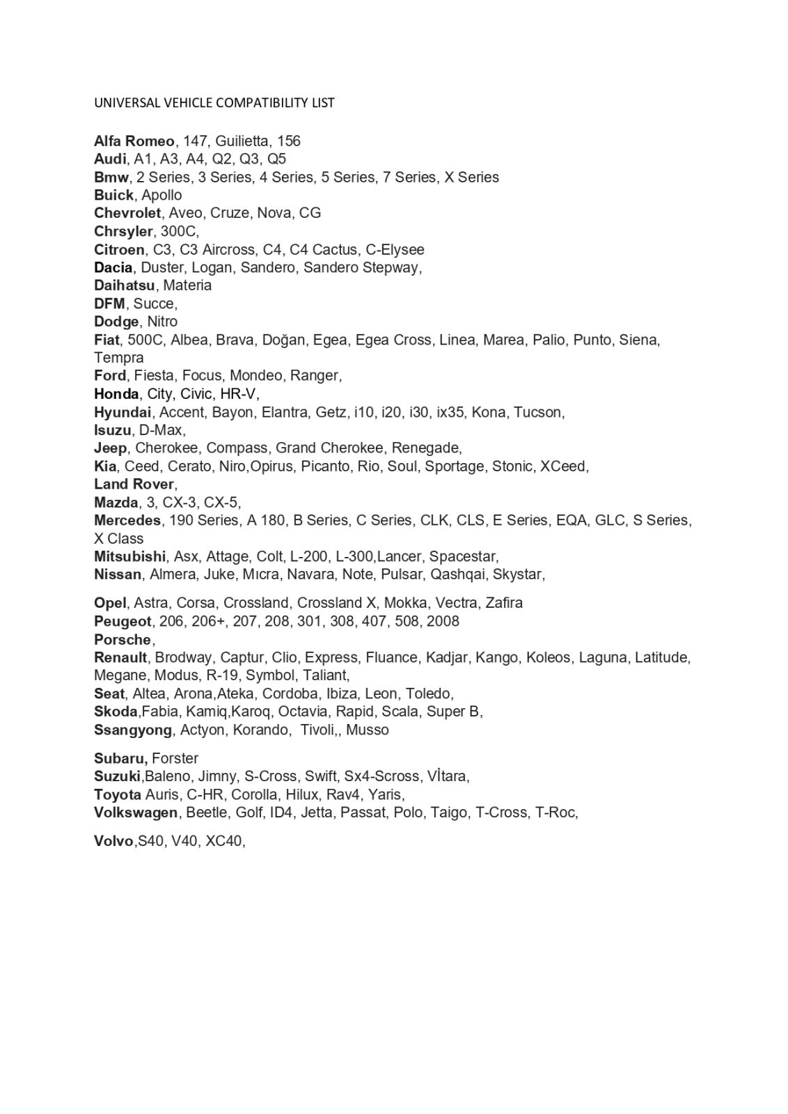 Mercedes-Benz: 190, A, B, C, CLA, CLK, E, G, GLA, ML, S, Citan, Sprinter, Vito, Vivaro