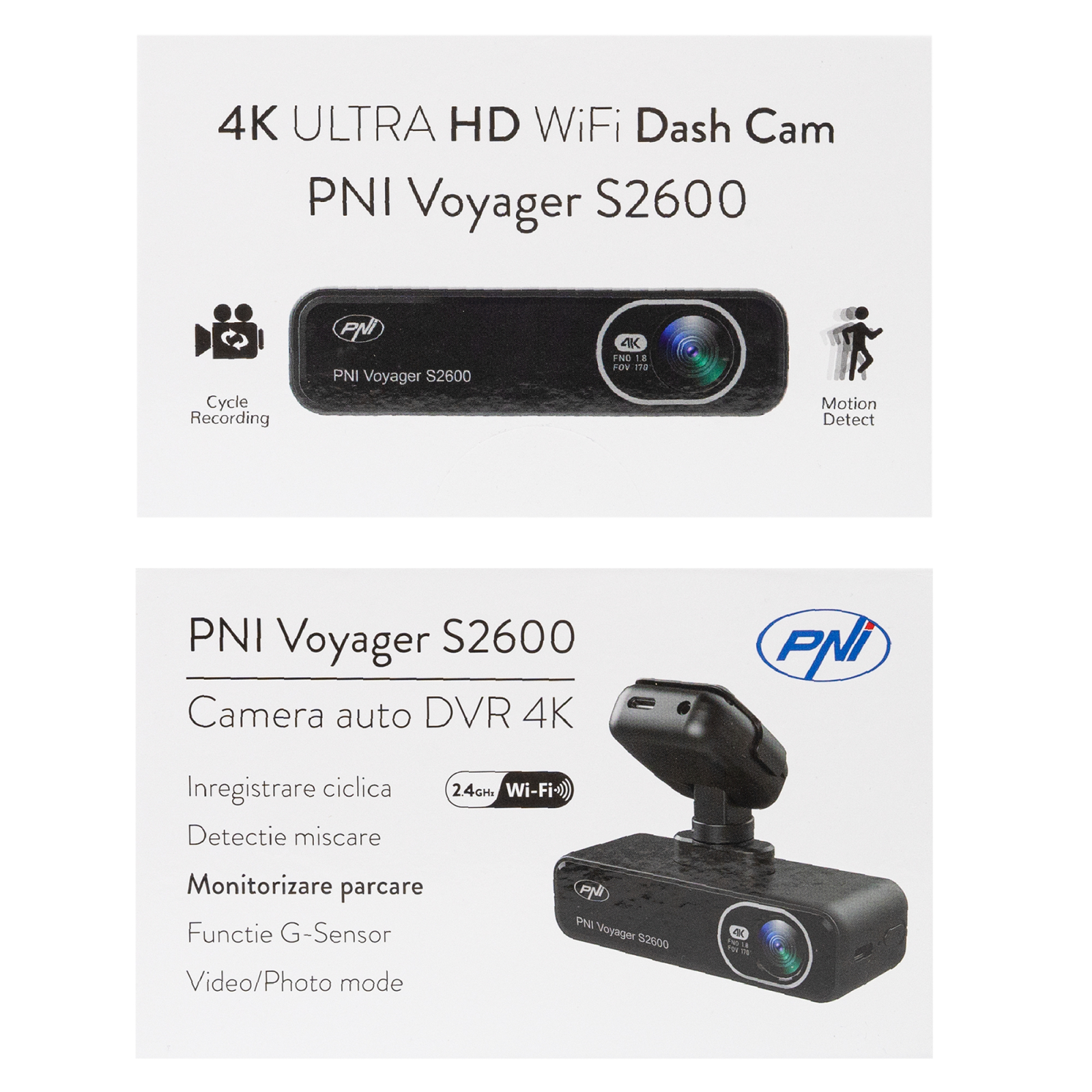 Camera auto DVR PNI Voyager S2600, WiFi, 4K Ultra HD, GPS si card de memorie microSD 128GB inclus