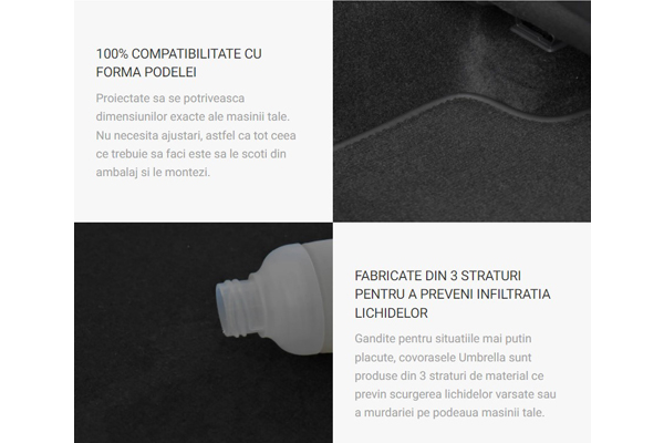 Covorasele sunt 100% adaptabile masinii tale. Acest lucru confera siguranta datorita lipsei alunecarii acestora si in acelasi timp acopera intraga suprafata a podelei. Cusatura de margine este din piele ecologica, de culoare neagra si confera masinii un aspect placut si elegant. Covoarele sunt etanse, fiind fabricate din cel putin 3 straturi, unul dintre ele fiind conceput pentru a preveni scurgerile de apa. Covorasele au sistem de fixare in podea ce se potriveste cu prinderea originala (doar pentru modelele de masini care prezinta acest sistem de fixare din fabrica).