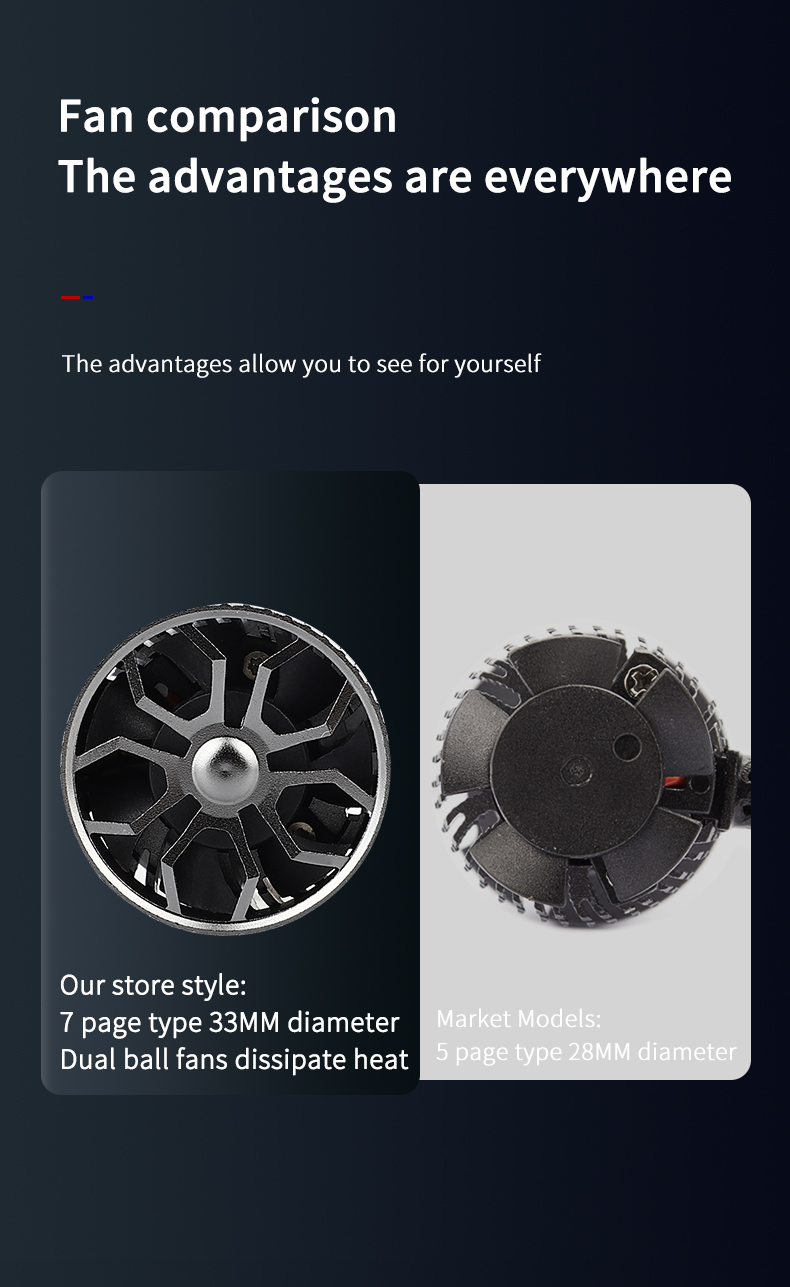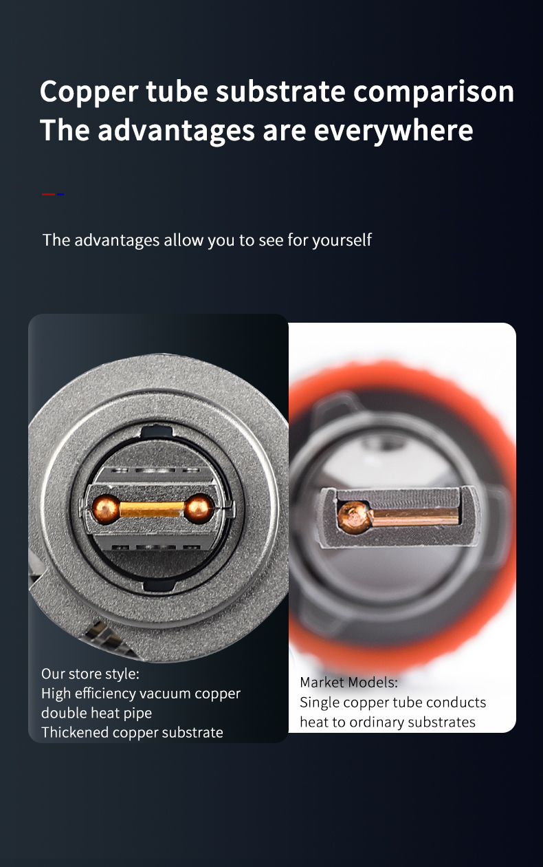 Construcție integrată cu un tub de cupru vid pentru o răcire mai eficientă. Componenta de cupru vid (tub termic) răcește de 200 de ori mai eficient decât profilul de cupru standard folosit pentru becurile LED standard pentru mașini.