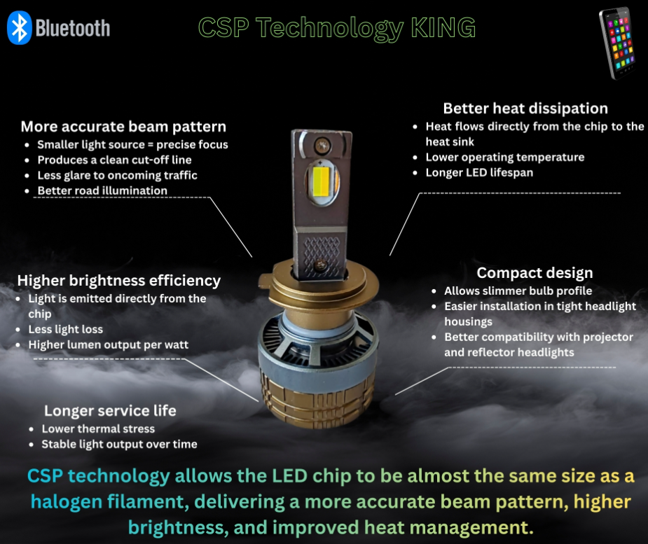 Cipurile CSP Dual Color sunt aproape identice ca dimensiune cu filamentul halogen, oferind: