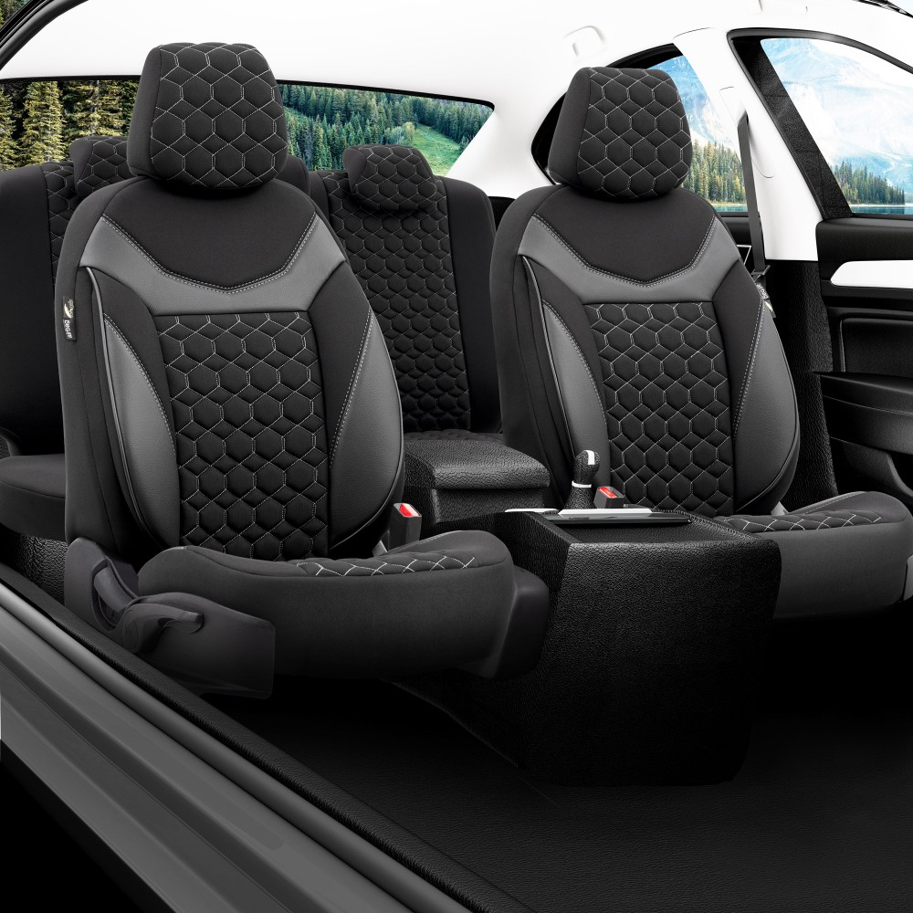 Huse din material textil dublu laminat similar cu tapiteriile originale (OEM), cu insertii de piele ecologica si ambele fete dublate cu burete (5mm grosime);