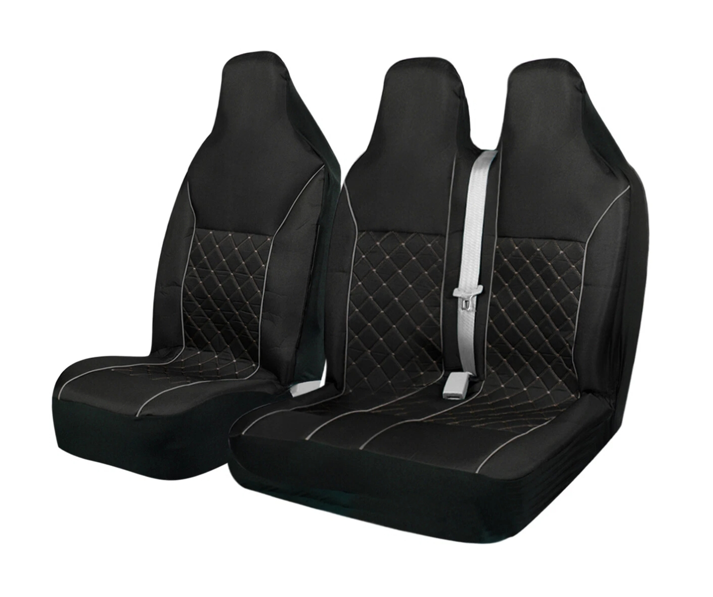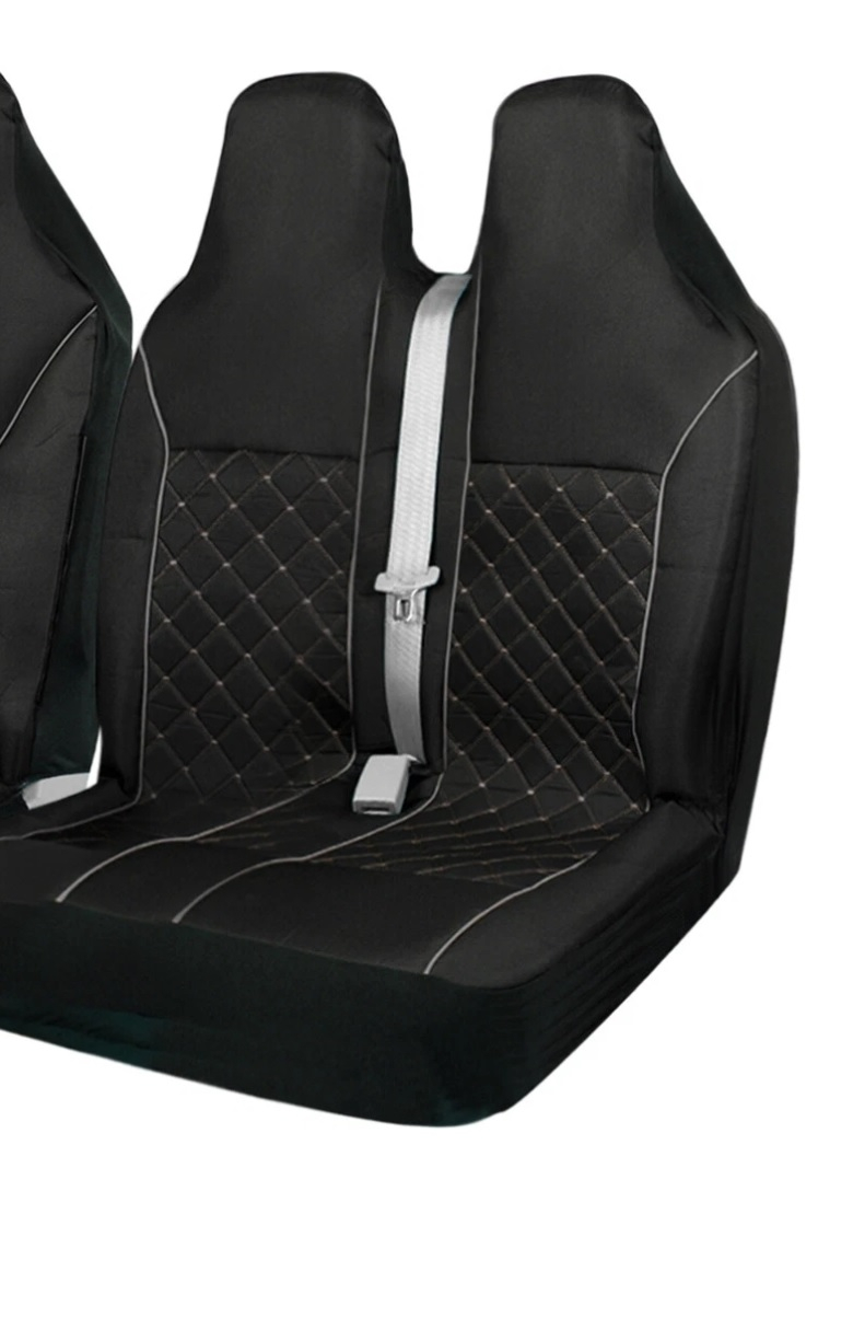 Husa de inalta calitate pentru scaunele din fata ale unui microbuz, realizata din material textil rezistent, cu design elegant capitonat si cusatura decorativa gri. Modelul este conceput pentru a oferi un aspect modern si profesional interiorului, asigurand in acelasi timp confort sporit si protectie eficienta pentru scaunele originale.