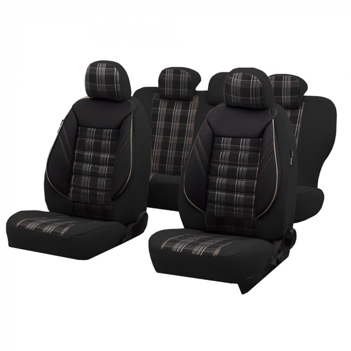 Huse din material textil dublu laminat similar cu tapiteriile originale (OEM), cu insertii de piele ecologica si ambele fete dublate cu burete (5mm grosime)